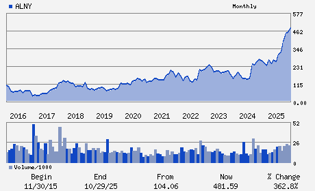 | Alnylam Pharmaceuticals Inc. is a development-stage biopharmaceutical company focused on the development of novel therapeutics based on RNA interference. The company's pipeline of experimental RNAi therapeutics is focused across three strategic therapeutic areas - genetic medicines, cardio-metabolic disease and hepatic infectious disease. The company's lead drug-Onpattro received regulatory approvals in the United States and Europe for the treatment of hereditary transthyretin-mediated amyloidosis in adults. The FDA approved Givlaari for acute hepatic porphyria. The FDA approved Oxlumo injection for subcutaneous use, for the treatment of primary hyperoxaluria type 1 to lower urinary oxalate levels in pediatric and adult patients. Moreover, the company is evaluating inclisiran for hypercholesterolemia in partnership with The Medicines Company acquired by Novartis. The FDA approved Leqvio to reduce low-density lipoprotein cholesterol with two doses a year..