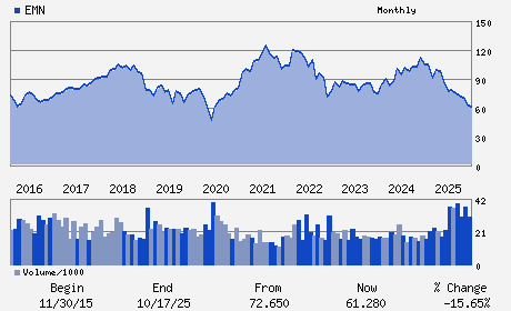 Eastman Chemical Company manufactures and sells chemicals, plastics and fibers. The company has manufacturing sites in the United States, Europe and Asia-Pacific, supplying products throughout the world. The company's products include additives, specialty polymers and other raw materials that are integral to the production of paints and coatings, inks, adhesives and other formulated products. It also makes intermediates based on acetyl and oxo chemistries and other intermediate products. Eastman Chemical's other products include performance chemicals, highly specialized copolyesters and cellulosic plastics, copolyester cellulosic based products, acetate tow and triacetin plasticizers, and natural and solution-dyed acetate yarns.