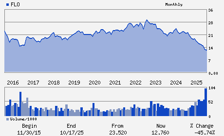 Flowers Foods, Inc. produces packaged bakery foods in the United States. The company specializes in baked food products as well as produces a wide range of breads, buns, rolls, snack cakes and tortillas. Some of the most popular brands of the company include: Nature's Own, Wonder, Dave's Killer Bread and Tastykake.