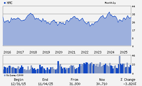 | Honda Motor Co., Ltd. is a leading manufacturer of automobiles and motorcycles in the world. Honda is recognized internationally for its wide variety of products, ranging from small general-purpose engines to specialty sports cars. Honda operates through 4 business segments: The?Automobiles?segment produces passenger cars, minivans, multi-wagons, sport utility vehicles and mini cars. The?Motorcycles?segment produces motorcycles consisting of sports, business and commuter models, all-terrain vehicles, personal watercraft and multi-utility vehicles. The?Financial Services?offers various financial services that include retail lending and leasing to customers, as well as other financial services, such as wholesale financing to dealers. The?Life Creation and Other?segment manufactures various power products, including solar cell batteries, power tillers, portable generators, grass cutters, outboard marine engines, water pumps, snow throwers, power carriers and sprayers, lawn mowers and tractors.