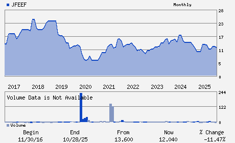 | JFE Holdings, Inc. is engaged in steel, engineering and trading businesses primarily in Japan and internationally. The company's product consists of sheets, plates, shapes, pipes and tubes, stainless and specialty steels, electrical steel sheets, and bars and wire rods as well as iron powders and titanium. JFE Holdings, Inc. is headquartered in Tokyo, Japan.