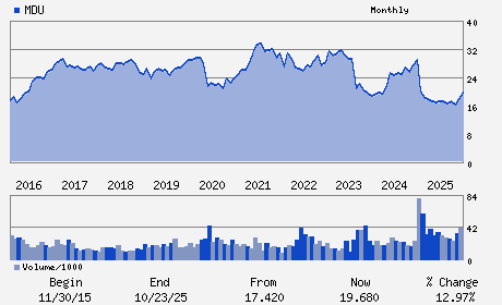 | MDU Resources Group, Inc. is a utility natural gas distribution company. It provides natural resource products and related services, essential for energy transportation, regulated energy delivery and construction materials & services business. The company operates through regulated energy delivery platform and construction materials and services platform. It has five reportable business segments: Electric, Natural gas distribution, Pipeline, Construction materials and contracting, and Construction services. The Electric segment and The Natural Gas Distribution segment generate, transmit, and distribute electricity and gas respectively, in many states in the U.S. The Pipeline segment provides natural gas transportation, underground storage and gathering services. The Construction Materials and Contracting segment mines, processes as well as sells construction aggregates, produces & sells asphalt mix, and supplies ready-mixed concrete. The Construction Services segment provides all contracting related services.