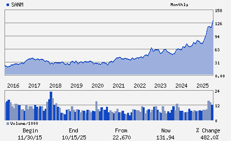 Sanmina Corporation is engaged in providing electronics contract manufacturing services. It focuses on engineering and fabricating complex components and also on providing complete end-to-end supply chain solutions to Original Equipment Manufacturers. The Company's services include product design and engineering, including initial development, detailed design, prototyping, validation, preproduction services and manufacturing design release; manufacturing of components, subassemblies and complete systems; final system assembly and test; direct order fulfillment and logistics services, and after-market product service and support. Sanmina Corporation, formerly known as Sanmina-SCI Corp., is based in San Jose, California.