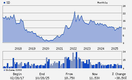 | SandRidge Energy, Inc. is an oil and natural gas company. It engaged in the development and production activities of oil and gas. The company's operating segment consists of Exploration and Production, Drilling and Oil Field Services and Midstream Gas Services. Exploration and Production segment is engaged in the acquisition, development and production of oil and natural gas properties. Drilling and Oil Field Services segment is engaged in the contract drilling of oil and natural gas wells. Midstream Gas Services segment is engaged in the purchasing, gathering, treating and selling of natural gas. SandRidge Energy, Inc. is headquartered in Oklahoma City, OK.
