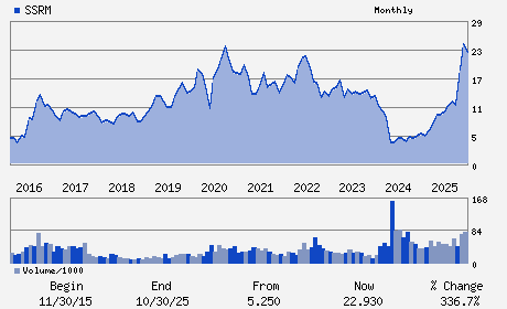 | SSR Mining Inc. is a mining company. It focused on the operation, development, exploration and acquisition of precious metal projects. The company primarily explores for gold, silver, and mineral properties. It principally serves electronics, coin fabrication, dentistry, jewelry, other industrial, technology, pharmaceuticals and solar energy markets. SSR Mining Inc, formerly known as Silver Standard Resources Inc, is based in Vancouver, Canada. Number of Employees: 2,300 |  |  |