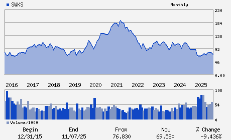 | Skyworks Solutions Inc. designs, manufactures, and markets a broad range of high-performance analog and mixed signal semiconductors that enable wireless connectivity. The company's products include power amplifiers (PAs), front-end modules (FEMs), radio frequency (RF) sub-systems, and cellular systems. Leveraging its core analog technologies, the company also offers a diverse portfolio of linear integrated circuits (ICs) that support automotive, broadband, cellular infrastructure, industrial and medical applications. The company has designed its product portfolio around two markets: cellular handsets and analog semiconductors.