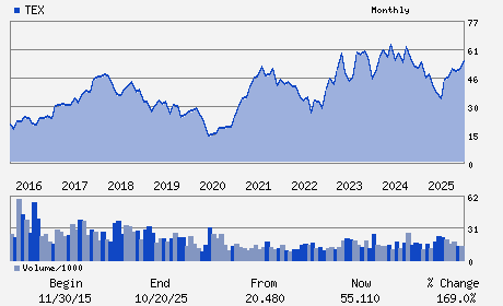 Terex Corporation is a global manufacturer of aerial work platforms, materials processing machinery and cranes. It designs, build and support products used in construction, maintenance, manufacturing, energy, minerals and materials management applications. The company's manufacturing facilities are located in the United States, Canada, Europe, Australia, Asia and South America. Terex sells its products through a worldwide distribution network. Terex also offers a complete line of financial products and services to assist in the acquisition of equipment through Terex Financial Services.