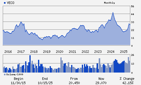 Veeco Instruments Inc. is engaged in the design, development, manufacture and support of thin film process equipment, primarily sold to make electronic devices. Veeco's process equipment solutions enable the manufacture of LEDs, power electronics, hard drives, MEMS and wireless chips. They are the market leader in MOCVD, MBE, Ion Beam and other advanced thin film process technologies. The Company's portfolio of technology solutions focus on market areas, including Lighting, Display & Power Electronics; Advanced Packaging, micro-electromechanical systems (MEMS) & radio frequency (RF); Scientific & Industrial, and Data Storage. The Company's System products include Metal Organic Chemical Vapor Deposition Systems, Precision Surface Processing Systems, Ion Beam Etch and Deposition Systems, Molecular Beam Epitaxy Systems, and Other Deposition and Industrial Products. The Company's original name `Veeco` stood for Vacuum Electronic Equipment Company.