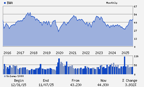| BorgWarner, Inc. is a global leader in clean and efficient technology solutions required for combustion, hybrid and electric vehicles. Its products include four-wheel-drive and all-wheel-drive transfer cases (primarily for light trucks and sport utility vehicles or SUVs), as well as automatic transmission and timing chain systems. These products are aimed at to improve vehicle performance, propulsion efficiency, stability and air quality. These products are produced and sold worldwide, primarily to OEMs of passenger cars, SUVs, trucks and commercial transportation products. BorgWarner's largest customers include Volkswagen and Ford. The company operates manufacturing facilities catering to the customers in Europe, the Americas and Asia and is an original equipment supplier to every major automotive OEM in the world.