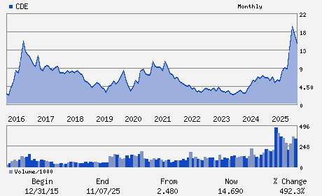 | Coeur Mining, Inc. operates as a primary silver and gold producer with precious metals mines in the Americas. The company's principal properties include the Palmarejo silver-gold mine in Mexico, the San Bartolome silver mine in Bolivia, the Rochester silver-gold mine in Nevada and the Kensington gold mine in Alaska. It also conducts ongoing exploration activities in Alaska, Argentina, Bolivia, Mexico, and Nevada. Coeur Mining, Inc., formerly known as Coeur d'Alene Mines Corporation, is headquartered in Chicago, Illinois.
