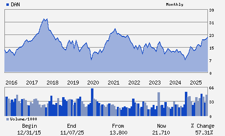 | Dana Inc. is a provider of technology driveline, sealing and thermal-management products. The company's operating segment consists of Light Vehicle Driveline Technologies, Commercial Vehicle Driveline Technologies, Off-Highway Driveline Technologies and Power Technologies. It operates primarily in North America, South America, Europe and Asia pacific. Dana Inc., formerly known as Dana Holding Corporation, is headquartered in Maumee, Ohio.
