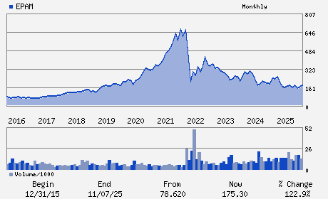 | EPAM Systems, Inc. is a software engineering and IT consulting services. Its software product development services include product research, design and prototyping, product development, component design and integration. EPAM's custom application development services comprise business and technical requirements analysis, solution architecture creation and validation, development, component design and integration. The application testing services, the company offers software application testing, testing for enterprise IT and consulting services. EPAM's infrastructure management services include applications, database, network, server, storage, and systems operations management, as well as incident notification and resolutions. The company has six operating verticals - Financial Services, Travel and Consumer, Software & Hi-Tech, Business Information & Media, Life Sciences & Healthcare and Emerging Verticals. The company client base, includes majority of Forbes Global 2000 corporations operating across the globe.