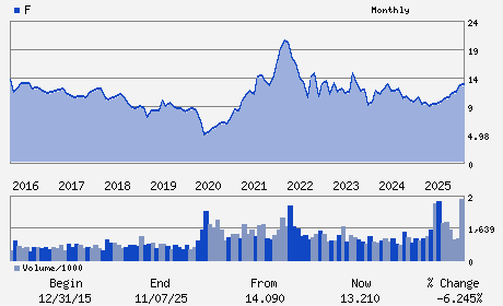 | Ford Motor Company designs, manufactures, markets and services cars, trucks, sport utility vehicles, electrified vehicles, and Lincoln luxury vehicles. Apart from vehicles, the company provides financial services through Ford Motor Credit Company LLC. Ford has three reportable operating segments: The Automotive segment is engaged in the design, development, manufacture, sale and service of Ford and Lincoln vehicles as well as service parts, and accessories. The company's wholesales primarily consisted of vehicles sold to dealerships. It also sells parts and accessories to authorized parts distributors and offers extended service contracts. The Mobility segment focuses on designing, building, growing and investing in mobility services, and autonomous technology businesses for the company. The segment works as a subsidiary of Ford under the name Ford Smart Mobility LLC. The Ford Credit?segment deals with vehicle-related financing and leasing activities.