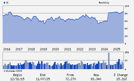 | Kellanova provide snacking, cereal and noodles as well as frozen foods. The company's brand including Pringles(R), Cheez-It(R), Pop-Tarts(R), Kellogg's Rice Krispies Treats(R), RXBAR(R), Eggo(R), MorningStar Farms(R), Special K(R)and Coco Pops(R). Kellanova, formerly known as Kellogg Company, is based in CHICAGO.