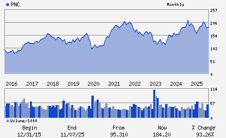 | The PNC Financial Services Group, Inc. provides consumer and business banking services. The company's principal subsidiary is PNC Bank. PNC Financial reports mainly through three business segments. Retail Banking provides deposit, lending, brokerage, insurance services, investment management, and cash management products and services to consumer and small business customers through a coast-to-coast branch network, automated telling machines (ATMs), call centers, and online & mobile banking channels. Corporate and Institutional Banking segment provides lending, treasury management, and capital markets-related products and services to mid-sized and large corporations, government and not-for-profit entities. Asset Management Group provides a wide range of wealth management products and services to individuals and their families, multi-generational family planning services to ultra-high net worth clients through the PNC Private Bank.