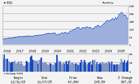 | Republic Services is the second largest provider of non-hazardous solid waste collection, transfer, disposal, recycling, and energy services in the United States. The company is engaged in landfill gas-to-energy and renewable energy projects. The company generates revenues mainly from its solid waste collection operations. The remaining revenue comes from other services, which includes transfer station, landfill disposal, recycling, and energy services. Collection Services unit provides commercial, residential, industrial and other services. Residential collection operations are performed under contracts with municipalities and include collection of refuse from containers into collection vehicles and dumped to transfer stations or landfills. On the commercial and industrial side, the company supplies its customers with waste containers and rents compactors to large waste generators. Transfer Services unit deposits waste at its transfer stations.