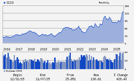 | Southern Copper Corporation engages in mining, exploring, smelting, and refining copper and other minerals. The company conducts exploration activities in Argentina, Chile, Ecuador, Mexico and Peru. Southern Copper has the largest copper reserves in the industry and operates high-quality, world-class assets in investment grade countries, such as Mexico and Peru.?