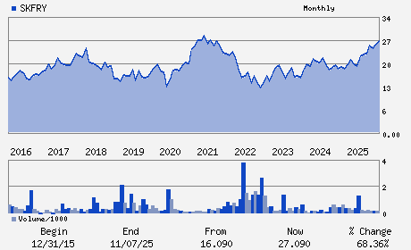 | SKF AB engages in the manufacturing of ball and roller bearings, seals, tools for mounting/dismounting bearings, lubricants and measuring/monitoring instruments. It also produces roller bearing steel and other special steels. The Company operates in three divisions: Industrial Division, Service Division and Automotive Division. It also offers products and knowledge-based services comprising hardware and software, consulting, mechanical services, predictive and preventive maintenance, condition monitoring, decision-support systems and performance-based contracts. SKF AB is headquartered in Gothenburg, Sweden.