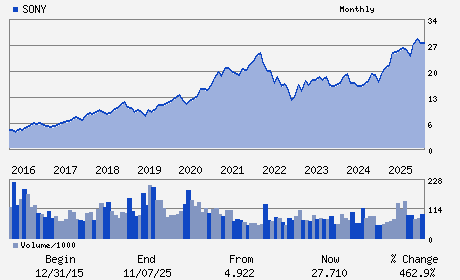 | Sony Group Corporation designs, manufactures and sells several consumer and industrial electronic equipment. The company's product roster comprises of audio and video equipment, televisions, displays, semiconductors, electronic components, gaming consoles, computers and computer peripherals and telecommunication equipment. Additionally, Sony is active in production, acquisition and distribution of motion pictures as well as television programming, along with the operation of television and digital networks. Further, the company has presence in the music and image-based software markets globally. (NOTE: Zacks identifies fiscal years by the month in which the fiscal year ends, while SONY identifies their fiscal year by the calendar year in which it begins; so comparable figures for any given fiscal year, as published by SONY, will refer to this same fiscal year as being the year before the same year, as identified by Zacks).