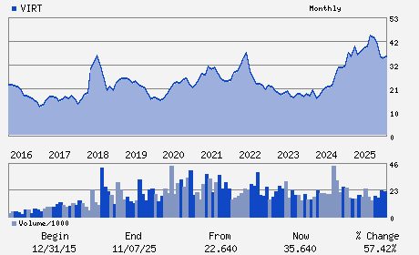 | Virtu Financial is a market-leading financial services firm that leverages cutting-edge technology to provide execution services and data, analytics and connectivity products to its clients and deliver liquidity to the global markets. It provides a wide array of offerings in execution, liquidity sourcing, analytics and broker-neutral, multi-dealer platforms in workflow technology. Its product suite allows clients to trade on several venues in more than fifty countries and in various asset classes, such as global equities, foreign exchange, futures, fixed income and myriad other commodities. Additionally, Virtu's integrated, multi-asset analytics platform provides a range of pre and post-trade services, data products and compliance tools that helps clients invest, trade and manage risk across global markets. The company interacts with retail brokers, Registered Investment Advisors, private client networks, sell-side brokers and buyside institutions.