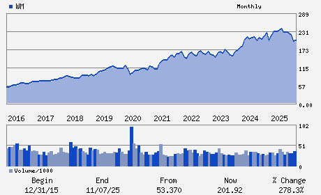 | Waste Management Inc. is a leading provider of comprehensive waste management services in North America. The company provides collection, transfer, recycling and resource recovery, as well as disposal services to residential, commercial, industrial and municipal customers. It is also a leading developer, operator and owner of waste-to-energy and landfill gas-to-energy facilities in the United States. Waste Management provides collection services that include picking up and transporting waste and recyclable materials from the point of generation to a transfer station, disposal site or material recovery facility (MRF). The company owns, develops, and operates landfill gas-to-energy facilities in the United States. It owns and operates transfer stations. Waste Management also provides materials processing, commodities recycling and recycling brokerage services.