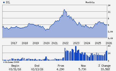 | ICL Group Ltd is engaged in the fertilizer and specialty chemical sectors. The company's operating segment includes Fertilizers, Industrial Products and Performance Products. Fertilizers segment is engaged in the production of standard, granular, fine red and white potash. Industrial Products segment produces flame retardants. Performance Products segment produces specialty phosphates, such as technical, food grade and electronic grade phosphoric acid, phosphate salts, food additives and wildfire safety products, as well as alumina and other chemicals. ICL Group Ltd, formerly known as Israel Chemicals Ltd, is based in Israel.